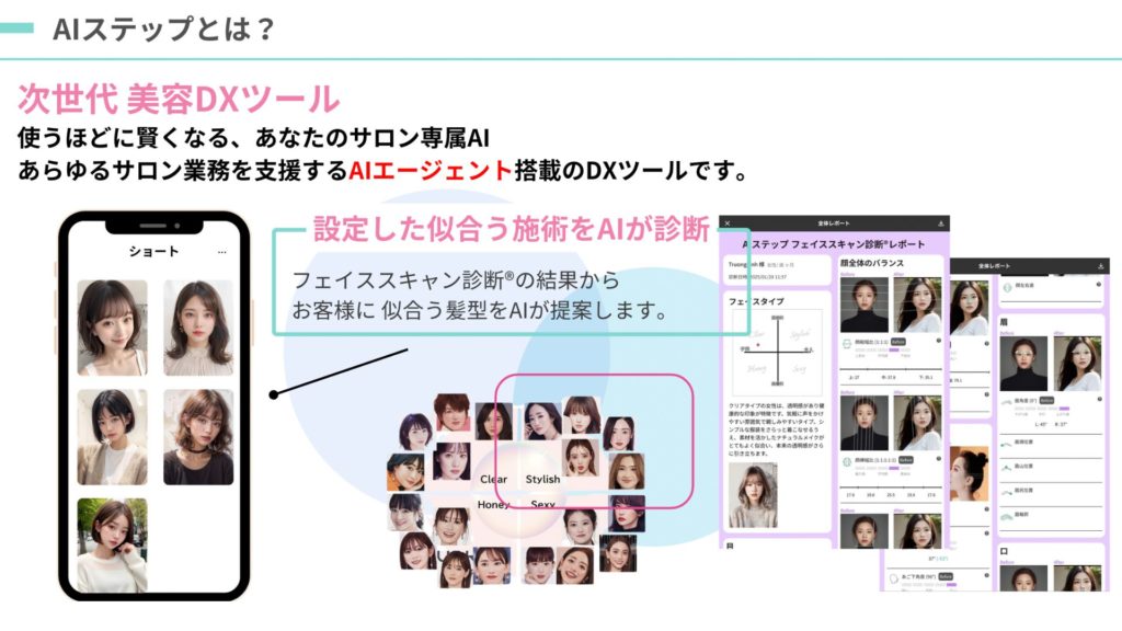 AIステップは、美容サロン向けの次世代DXツールです。スマートフォンで顔写真を撮影すると、AIがわずか約5秒で顔のバランスやパーツ配置を解析し、似合う髪型や施術を自動で提案します。診断結果はレポート形式で表示され、ビフォーアフターのシミュレーションや眉・輪郭の黄金比測定も可能。高齢者から若年層まで、利用者に合わせたスタイル提案を実現し、美容師のカウンセリングをサポートします。